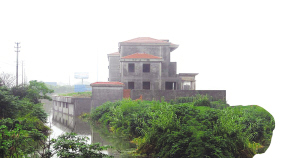 只見一排水泥建筑沿河而立,盡管只有三層樓,但層高明顯高于普通的住宅,毫不亞于民房的四層樓。在周圍綠化的掩映之下,這些別墅顯得頗為幽靜。盡管尚未進(jìn)行裝修,但已經(jīng)成形的水泥框架和墻體,已經(jīng)能看出這些樓宇的不凡氣度,寬闊的樓梯不是一般的別墅所具備的。